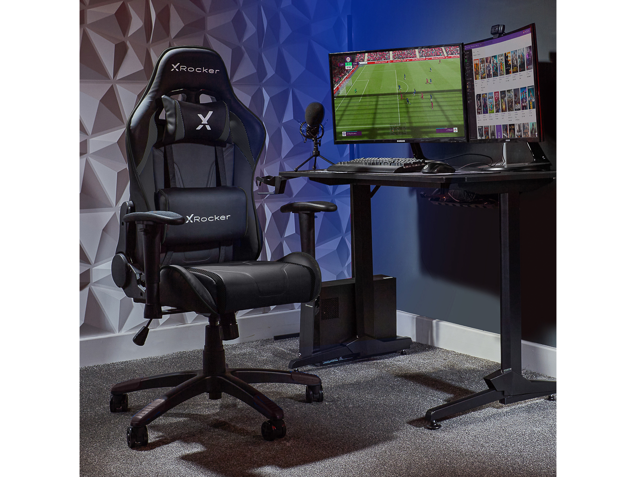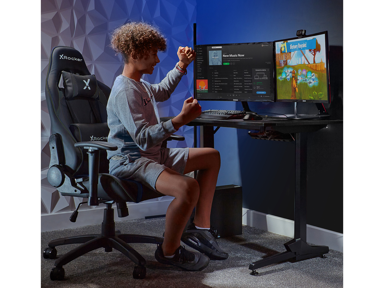 Mit dem X Rocker Agility Compact Gaming Stuhl sitzen Kinder, Jugendliche & kleinere Erwachsene bei Hausaufgaben, Gaming Sessions oder im Home-Office stets bequem. Der Agility Compact bietet ein komfortables ergonomisches Design und kann an die Bedürfnisse der Nutzer angepasst werden. So lassen sich Sitzhöhe und die Höhe der 3D-Armlehnen im Handumdrehen verstellen. Zwei zusätzliche Komfortkissen können zur Unterstützung des Nackens und des Lendenwirbelbereichs genutzt werden, um die optimale Sitzposition zu erreichen. Die angenehme Polsterung sowie die weiche Oberfläche sorgen für weiteren Komfort. Dank der Wippmechanik kann die Rückenlehne um bis zu 120° nach hinten geneigt werden, um sich entspannt zurückzulehnen. Der X Rocker Bürostuhl steht stabil auf einem Fußkreuz mit 5 Rollen und kann somit flexibel im Raum bewegt werden. Der X Rocker Agility Compact Gaming Stuhl ist für ein maximales Belastungsgewicht von 100 kg ausgelegt.
