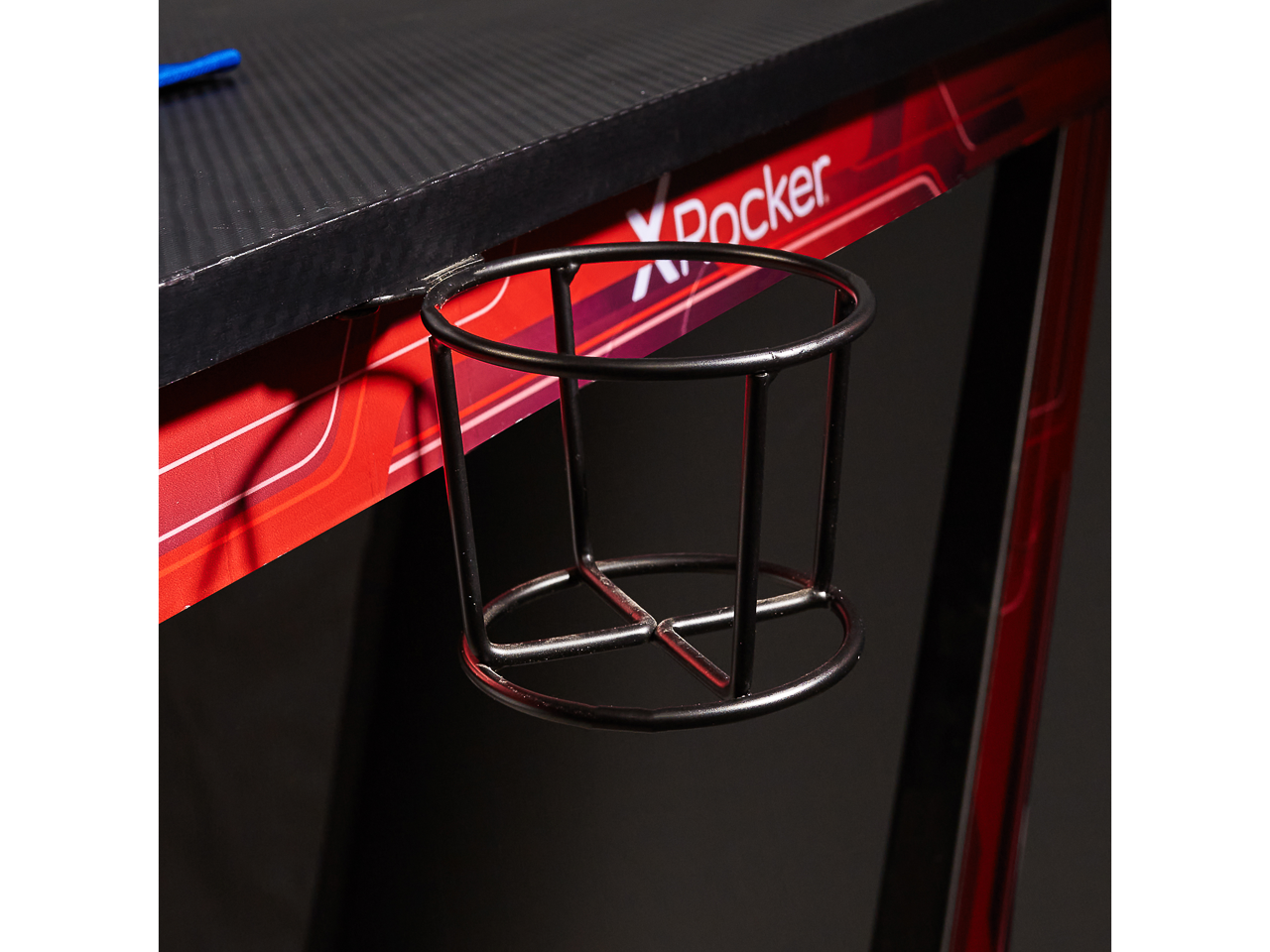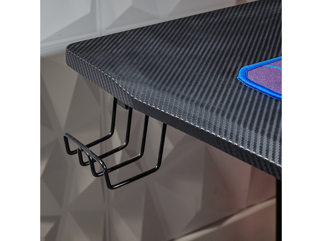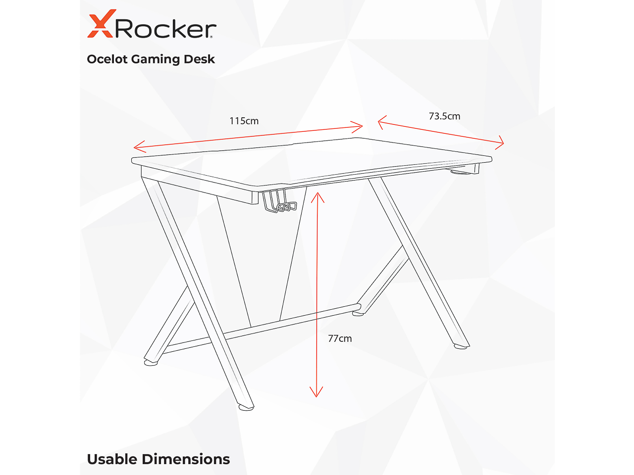 Der X Rocker Ocelot Gaming Tisch ist die perfekte Basis für lange Gaming Sessions oder die gewöhnliche Schreibtischarbeit. Der coole Ocelot Tisch überzeugt mit einem einfachen aber stylischen Design, das durch die dunkelgraue Carbon-Beschichtung der Tischplatte abgerundet wird. Das auffällige Kreuzboden Design kann mit den mitgelieferten Aufklebern in Blau und Rot veredelt werden. 2 Öffnungen im Tisch führen Kabel von Monitoren oder anderem Equipment an die Rückseite des Tisches und lassen sich so besser organisieren. Somit bleibt die Gaming Basis stets aufgeräumt und behält ihren coolen Look! Besonders praktisch: Am Tisch lassen sich 2 Halterungen für ein Headset sowie einen Becher befestigen, um für die nächste Gaming-Session alles Griffbereit zu haben.