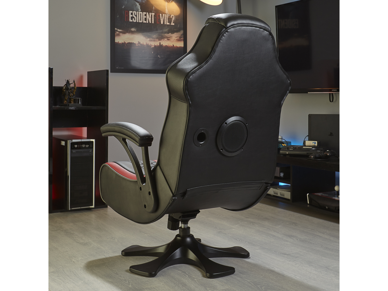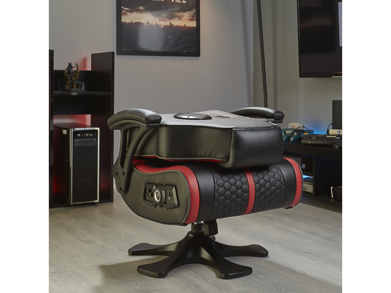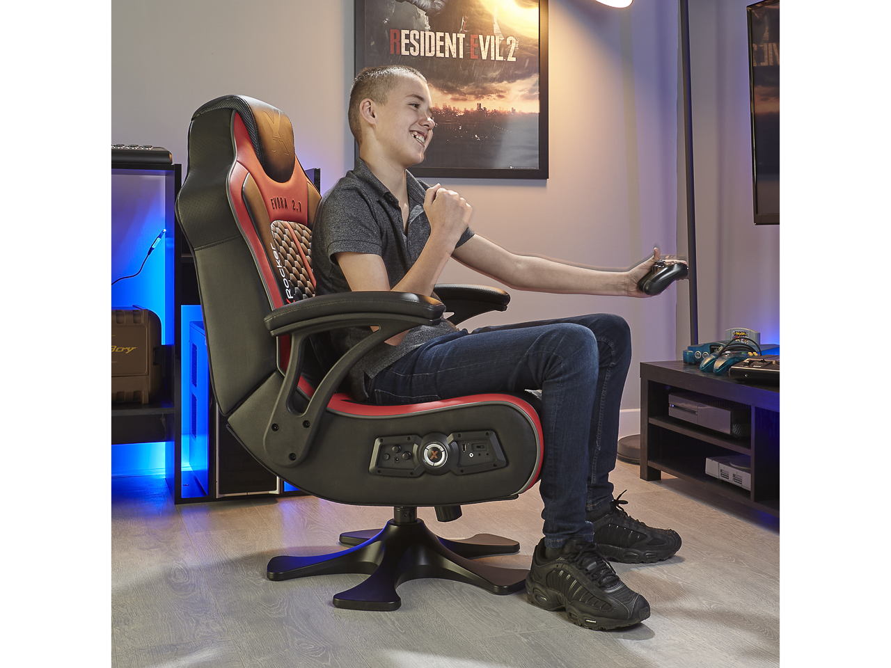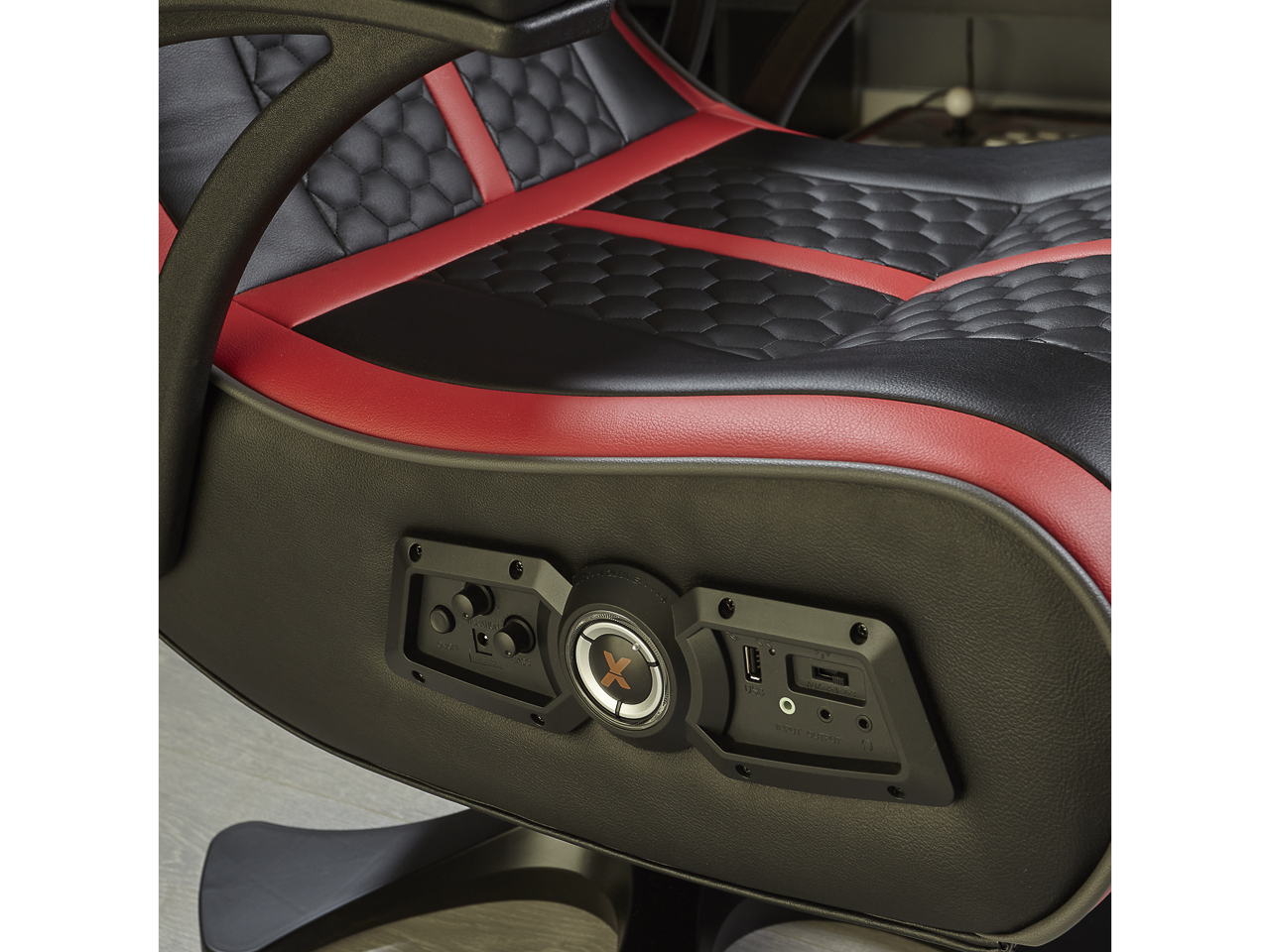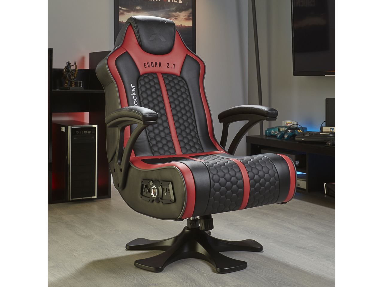 Der X Rocker Evora 2.1 bietet maximalen Komfort beim Spielen und erweitert das Gaming Erlebnis! So ist der Gaming Sessel mit 2 Lautsprechern, die in der Kopfstütze verbogen sind, ausgestattet. Ein Subwoofer in der Rückenlehne sorgt zudem für einen satten Bass. Besonderes Highlight: Dank der Trimotor-Vibrationstechnologie werden Gamingaktionen spürbar! So reagiert der Stuhl auf Soundereignisse und macht Spielsequenzen noch realistischer.