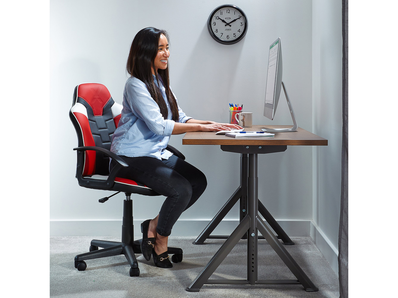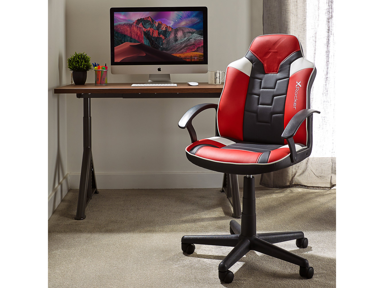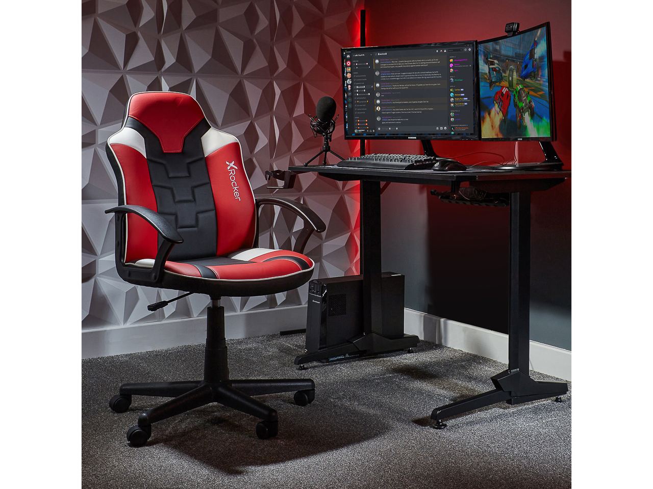 So machen Hausaufgaben, lange Lernphasen oder Gaming Sessions am Schreibtisch Spaß! Mit dem coolen X Rocker Saturn Bürostuhl sitzen Kinder und Jugendliche stets bequem – auch bei längerem Sitzen. Dank des ergonomischen Designs der Rückenlehne wird der Rücken optimal unterstützt während die beiden Armlehnen für zusätzlichen Komfort sorgen. Über einen Hebel lässt sich die Sitzhöhe einfach verstellen, um die optimale Position einzurichten. Der X Rocker Drehstuhl steht stabil auf einem Fußkreuz mit 5 Rollen und kann somit flexibel im Raum bewegt werden. Optisch überzeugt der Schreibtischstuhl durch ein cooles Gaming Design und der pflegeleichten und beständigen Oberfläche aus Kunstleder. Verschmutzungen können somit einfach weggewischt werden. Der X Rocker Saturn Gaming Stuhl ist für ein maximales Belastungsgewicht von 100 kg ausgelegt.