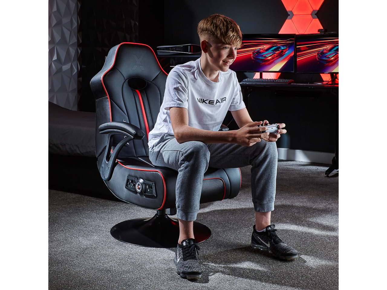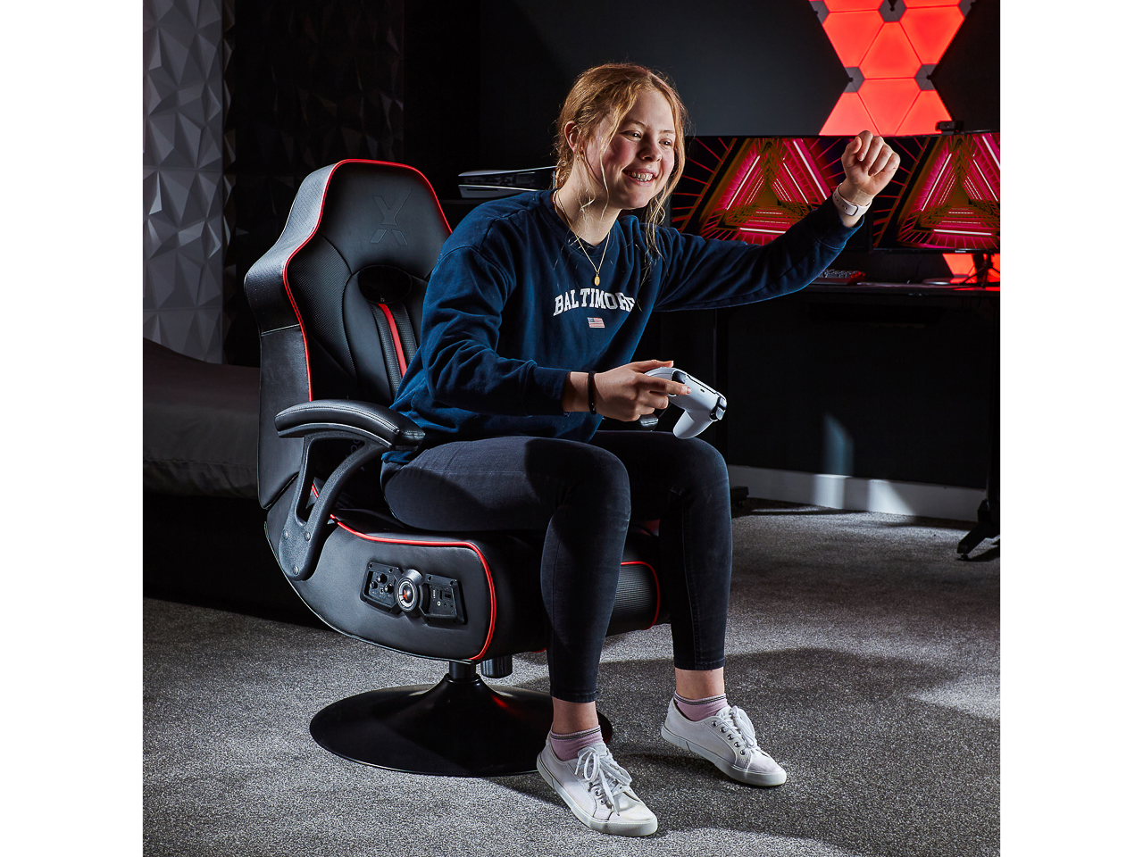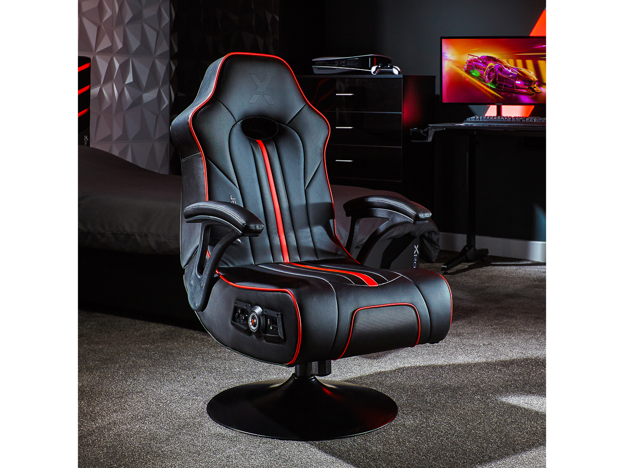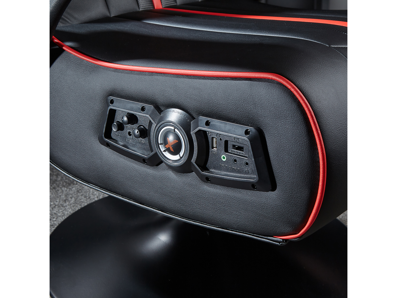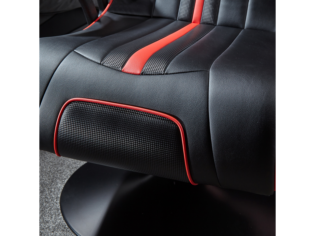 Der X Rocker Torque 2.1 ist ein attraktiver und komfortabler Gaming- Stuhl mit einem Wireless/Bluetooth 2.1-Audiosystem, das sich mit all Ihren Lieblingsspielkonsolen von PlayStation, Xbox oder Nintendo verbinden lässt. Die klangreaktiven Vibrationsmotoren verbessern das Spielerlebnis, und die tief gepolsterten Armlehnen und der Sitz bieten hervorragenden Komfort für lange Spielsessions.